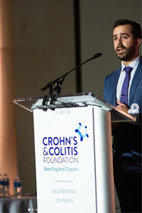 En tant que membre du comité des jeunes professionnels de la section de la Nouvelle-Angleterre de la Crohn’s & Colitis Foundation’, Shaun Campos se réjouit de parler de ses 22 années de vie avec une stomie. « Ma stomie a été présente à chaque moment décisif de ma vie, » dit-il. « Mes premiers rendez-vous, mon premier jour à l'université, mon premier marathon. Elle m'a donné la force de réussir. »